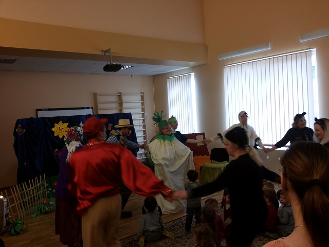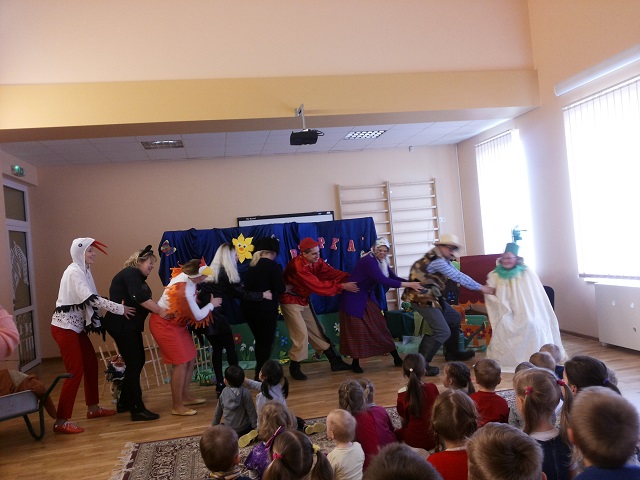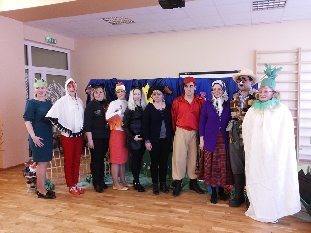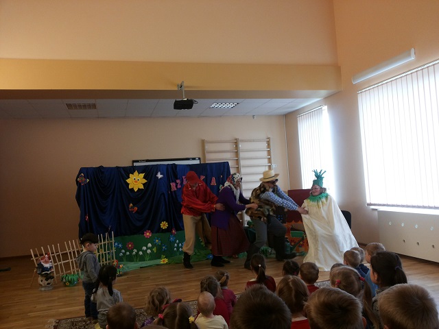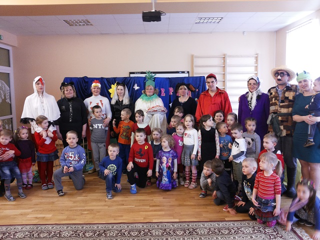 W żłobku-przedszkolu w Awiżeniach, w ramach projektu ,,Za gόrami i lasami w bajkowej krainie”, odbyło się przedstawienie Juliana Tuwima „Rzepka“. Rodzice dzieci uczęszczających do grupy ,,Motylki” przygotowali niespodziankę. Tym razem to oni wystąpili dla swoich pociech z inscenizacją ,,Rzepki”. Zaskoczenie przedszkolakόw było ogromne, gdy wśród aktorów rozpoznali mamę lub tatę. Zarówno widownia, jak i aktorzy doskonale bawili się podczas występu. Przedszkolaki zachwycali się wspaniałymi, kolorowymi strojami oraz tańcem przy znanych piosenkach. Dzieci z zainteresowaniem oglądały przygody dziadka i jego pomocników, którzy z całych sił próbowali wyciągnąć rzepkę. Rodzice wykazali się olbrzymim zaangażowaniem oraz pomysłowością w wykonaniu strojów oraz wielką odwagą w naśladowaniu gestów danej postaci. Rodzicom zależało przede wszystkim na dobrej zabawie i w różnorodny sposób rozbawiali swoje pociechy. Największym zaś prezentem dla nich okazała się spontaniczna radość i uśmiech na twarzach dzieci, którym bardzo podobało się przedstawienie. Wszyscy ,,aktorzy” spisali się na medal! Radość i oklaski od dzieci były największą nagrodą dla występujących rodziców. Serdecznie dziękujemy rodzicom za miłą współpracę i wspólną zabawę.