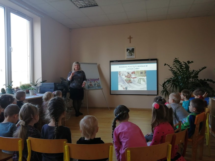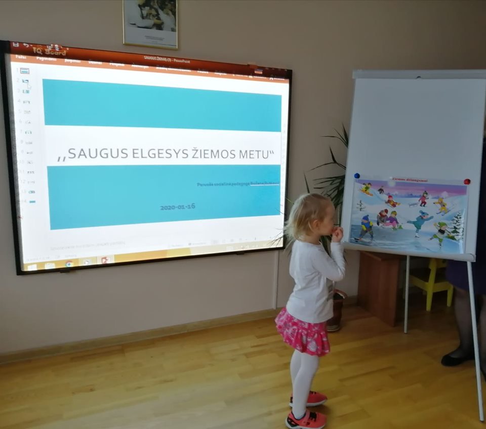 Sausio 9, 16 dienomis socialinė pedagogė ,,Motylki”, „Koraliki“, „Bitučių“ ir ,,Smalsučių” grupių ugdytiniams pravedė prevencinį užsiėmimą  tema ,,Saugus elgesys žiemos metu”. Ugdytiniai sužinojo, kokie pavojai lauke jų tyko žiemą ir susipažino su saugaus elgesio taisyklėmis lauke. Taip pat žiūrėjo filmuką ,,Žiemos pavojai”, kuriame žaismingai ir suprantamai vaikams buvo pateikiamos įvairios situacijos ir kaip jų išvengti, kaip elgtis tokiais atvejais. Ugdytiniai labai noriai atsakinėjo į klausimus bei spalvino paveiksliukus, kuriuose pavaizduotos žiemos pramogos.
