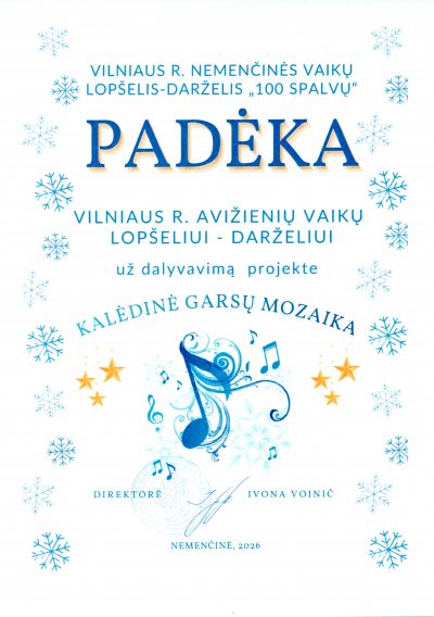 2026 m. sausio 8 d. Vilniaus r. Nemenčinės vaikų lopšelyje-darželyje ,,100 spalvų“ įvyko baigiamasis Vilniaus rajono ikimokyklinio ugdymo įstaigų projekto „Kalėdinė garsų mozaika“ renginys. Šioje šventėje dalyvavo mūsų ,,Koraliki“ ir ,,Motylki“ grupių ugdytiniai. Nuoširdžią padėką reiškiame muzikos mokytojai Elžbietai už kruopštų vaikų muzikinį parengimą, grupių mokytojoms Anai ir Alinai už profesionalų vaikų paruošimą, o tėvams už bendradarbiavimą ir aktyvų įsitraukimą. Ypatingą padėką reiškiame Avižienių gimnazijai už suteiktą mokyklinį autobusiuką, kuris padėjo užtikrinti sklandų vaikų dalyvavimą renginyje.